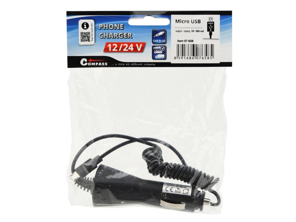 Cestovní nabíječka mobilních telefonů do automobilu s Micro USB.