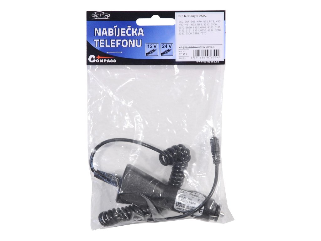Cestovní nabíječka mobilních telefonů do automobilu. Zástrčka do zásuvky automobilového zapalovače, automatická volba napájení 12V nebo 24V.