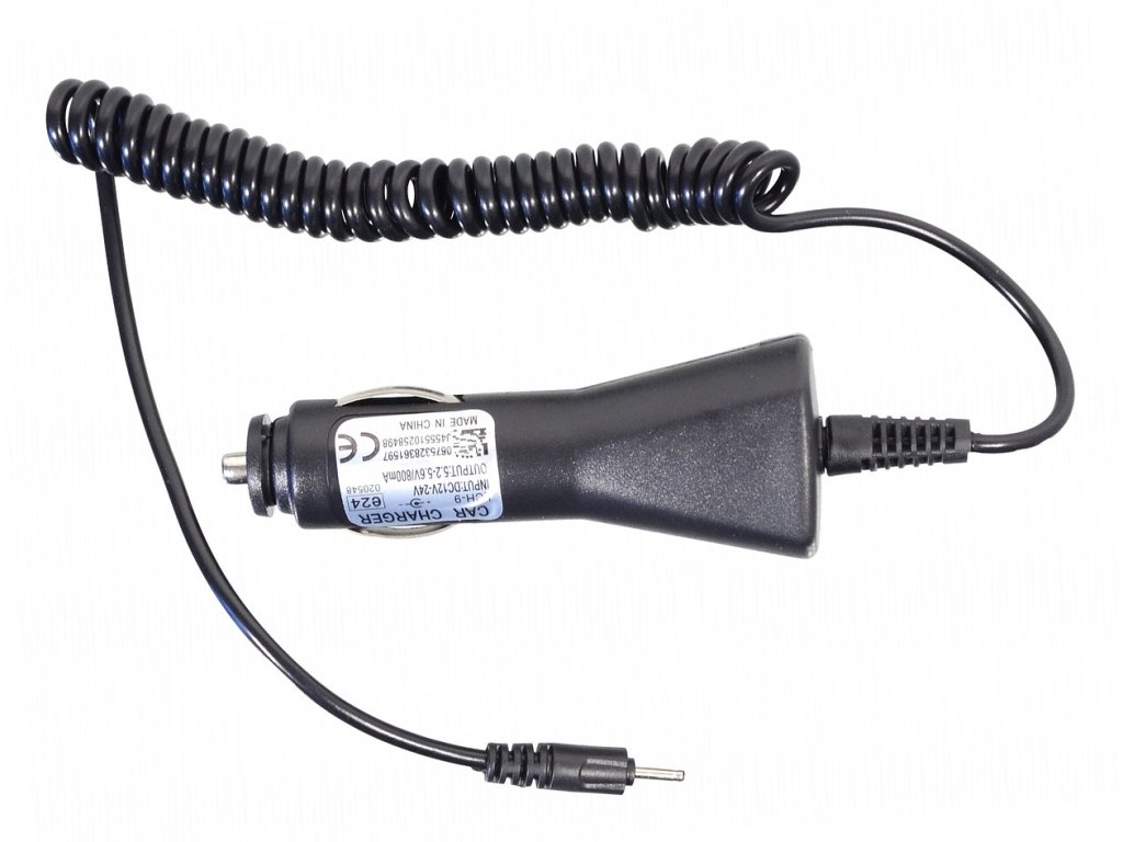 Cestovní nabíječka mobilních telefonů do automobilu. Zástrčka do zásuvky automobilového zapalovače, automatická volba napájení 12V nebo 24V.