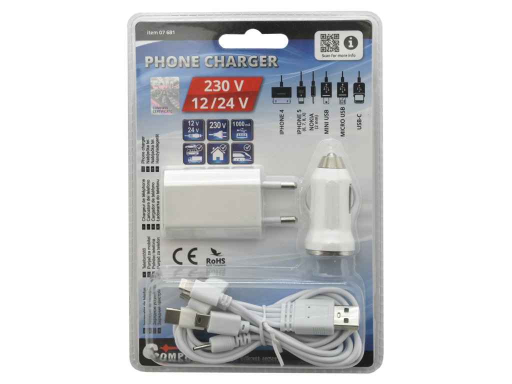 Nabíječka telefonu 230/12V 2,1A (Iphone, miniUSB, microUSB, USB-C)