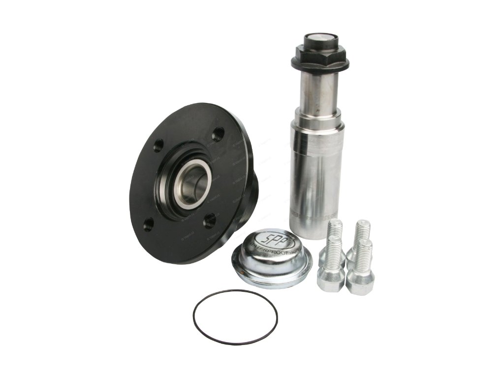 Kompletní náboj s ložisky, šrouby a montážním trnem, který lze přizpůsobit i na jiné druhy přívěsů (náhradní montážní díl)