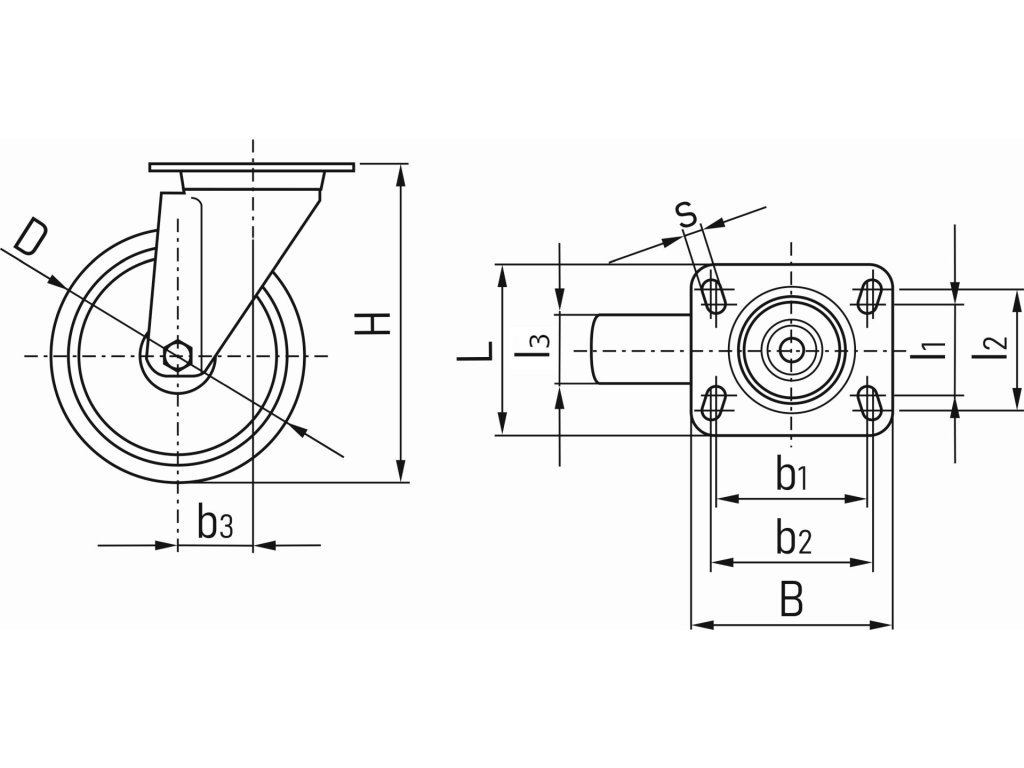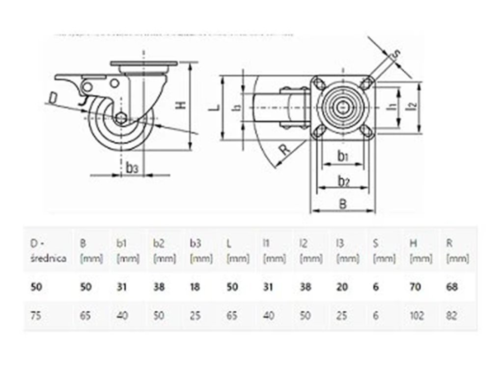 | D - średnica | B [mm] | b1 [mm] | b2 [mm] | b3 [mm] | L [mm] | l1 [mm] | l2 [mm] | l3 [mm] | S [mm] | H [mm] | R [mm] |