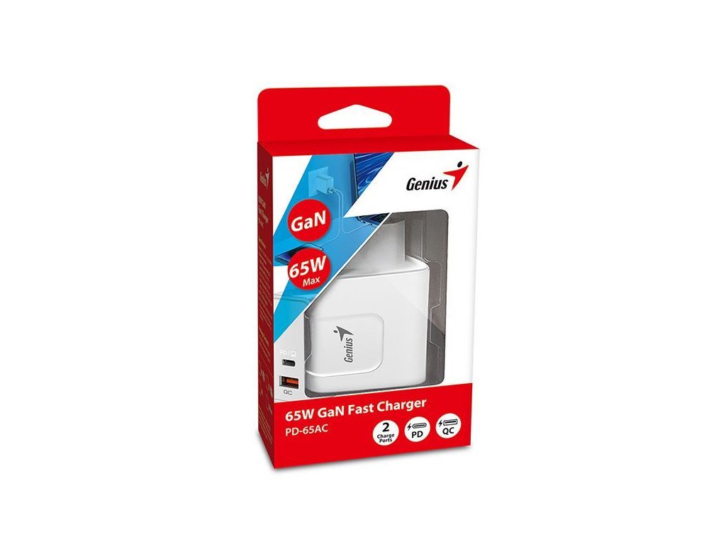Napáječ, síťový adaptér USB-C + USB-A 65W QC 3,0 Genius Genius PD-65ACNapájecí adaptér s výkonem 65 W pro tablety, smartphony či notebooky. Pro nabíjení zařízení jsou k dispozici konektory USB a USB-C. Adaptér podporuje protokoly rychlého nabíjení Power Delivery 3.0 a Quick Charge 3.0. Nabízí také nabíjení dvou zařízení současně o celkovém výkonu 55 W. Díky použití pokročilé technologie GaN je bezpečnější, méně se zahřívá a má menší rozměry než jiné adaptéry.