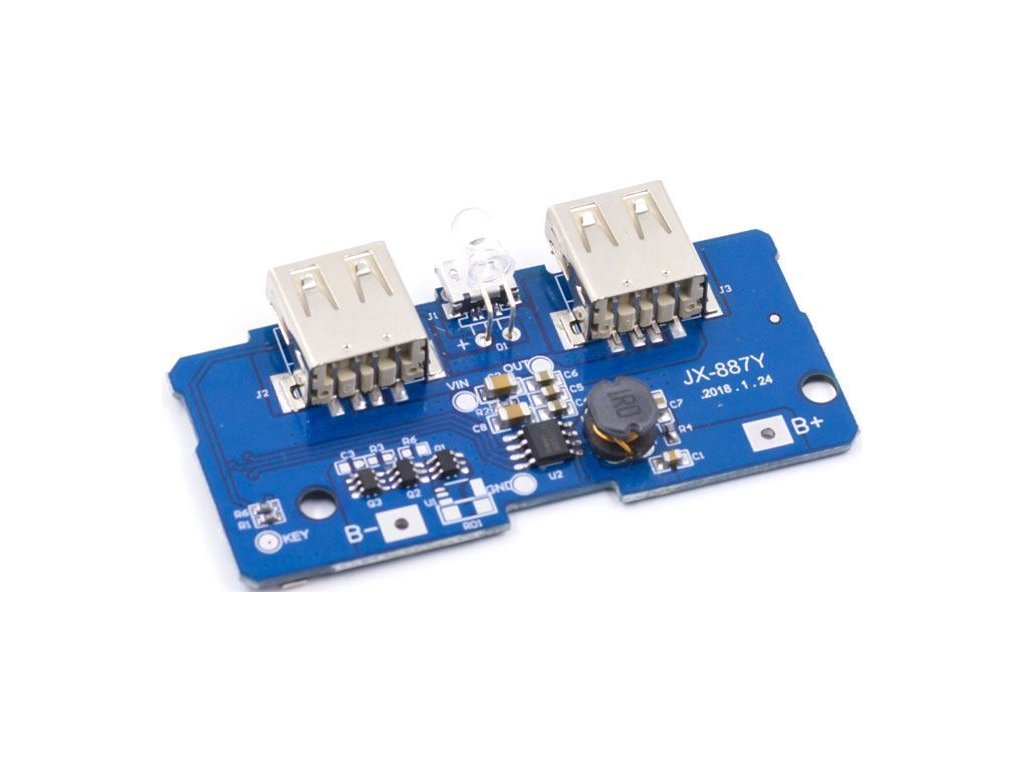 Univerzální modul kombinující nabíječku Li-Ion článků a step-up měnič pro napájení různých zařízení napětím 5V. Modul se zapíná automaticky po připojení zátěže ve výtupech USB A nebo manálně tlačítkemna modulu a vypne se automaticky cca 15sec po odpojení zátěže. Z modulu nelze čerpat energii při nabíjení. Primární použití modulu je v powerbankách.**Specifikace:**