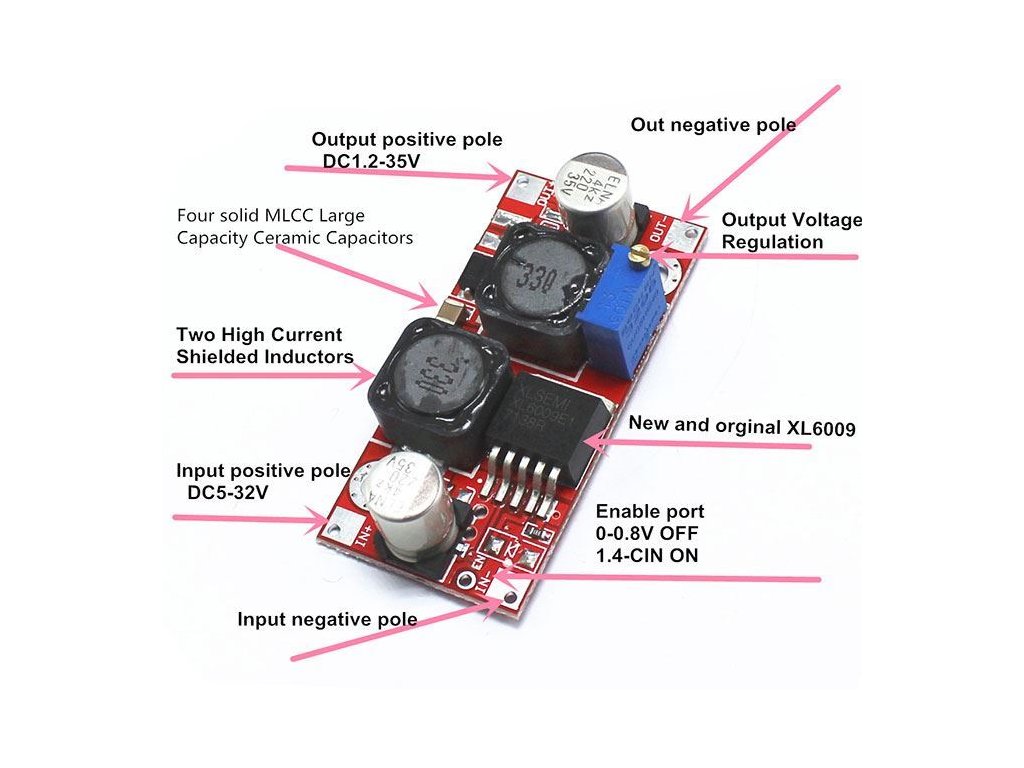 Napájecí modul XL6009, step-down/step-up měnič 3A Impulsní neizolovaný měnič DC-DC 5V-32V/1,25-35V 3A nastavitelný, přičemž modul může kontinuálně fungovat jako step-up(zvyšující) nebo step-down(snižující). Hodí se např. jako regulátor k solárním článkům.**Technické parametry:**
