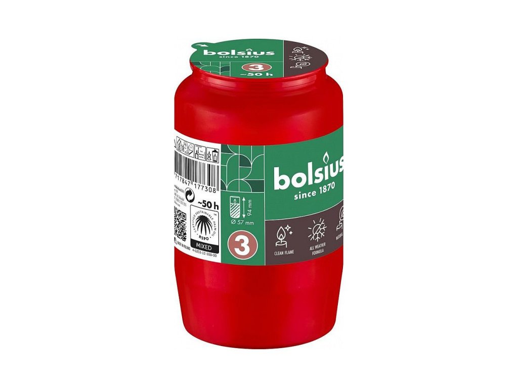Olejová náplň Bolsius vyhoří až do konce, hoří krásným rovnoměrným plamenem i při vysoké vlhkosti, větrném počasí nebo mrazu.