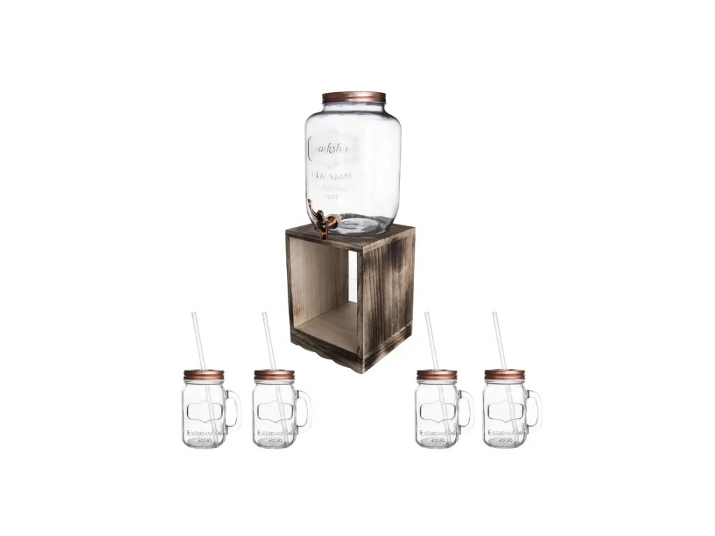 Dále je součástí sady dřevěný stojan o rozměrech 22,5×22,5×30 cm. Nejenomže skvěle vypadá, zároveň slouží jako podstavec, který usnadňuje manipulaci s kohoutkem a nalévání tekutiny do skleniček. K setu přidáváme i 4 kusy oblíbených sklenic STRAW o objemu 0,5 l, které mají kovová víčka na závit a brčka. Jejich plastický dekor ladí s dekorem džbánu.