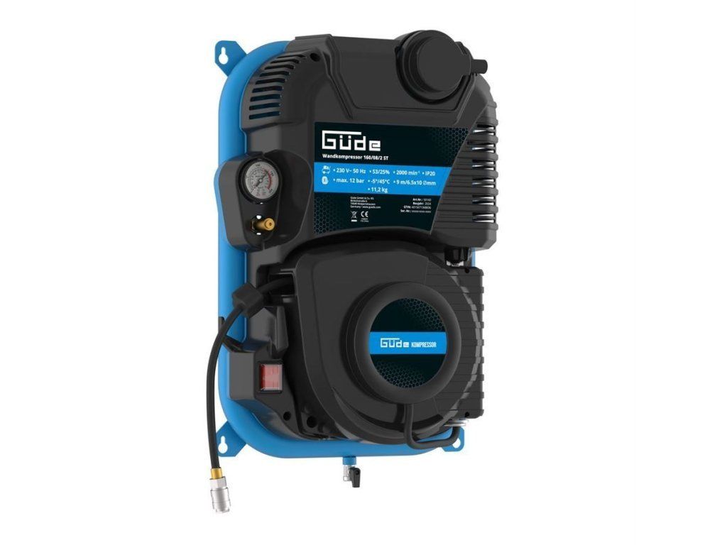 Nástěnný kompresor GÜDE 160/08/2 ST je kompaktní a praktický přístroj určený pro širokou škálu použití v domácnosti, dílně nebo garáži. Tento bezolejový kompresor nabízí snadnou instalaci na zeď, což šetří místo a zajišťuje pohodlný přístup. Je vybaven výkonným motorem s výkonem 1100 W a maximálním pracovním tlakem 8 barů, což umožňuje efektivní práci s různými pneumatickými nástroji a skvělou volbou pro všechny, kteří hledají spolehlivý a snadno ovladatelný kompresor s úsporným řešením prostoru.
