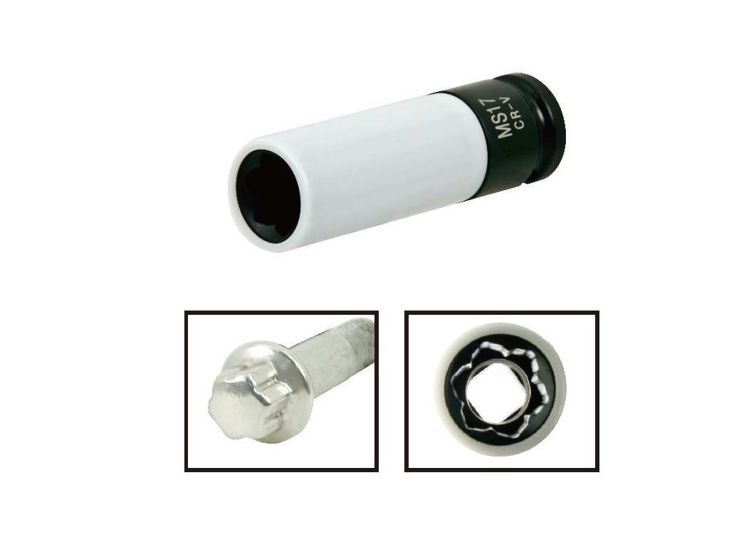 Nástrčná hlavice pro rázové utahováky velikosti MS17 Jonnesway AG010204Chrom-vanadiová ocel, s plastovou ochrannou krytkou pro ALU kola zejména vozidel Mercedes-Benz.