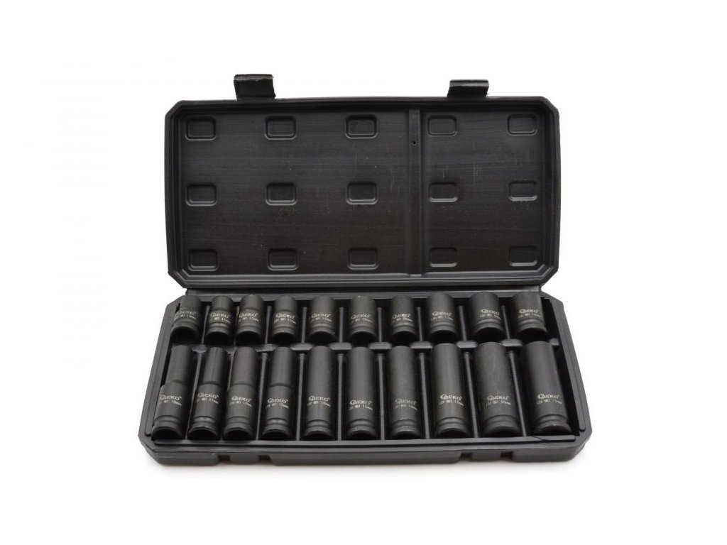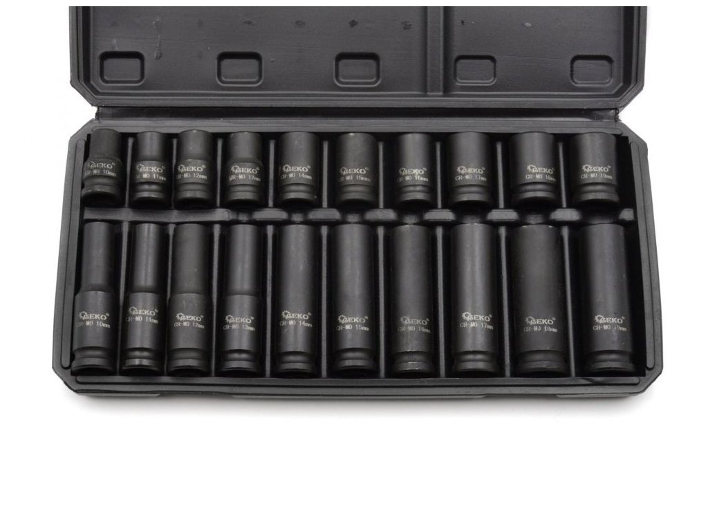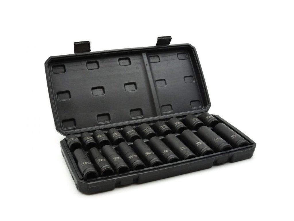 Sada dlouhých a krátkých 1/2" rázových nástrčných klíčů o velikosti od 10 do 19 mm. Hlavice jsou vyrobeny ze zesílené chrom-molybdenové oceli. Přidání molybdenu zabraňuje deformaci a zvyšuje obecnou odolnost tohoto typu oceli vůči korozi ve vlhkém a kyselém prostředí. vyrobené z plastu. Hlavice jsou umístěny v praktickém plastovém kufru.