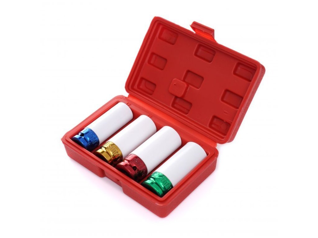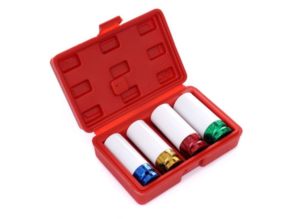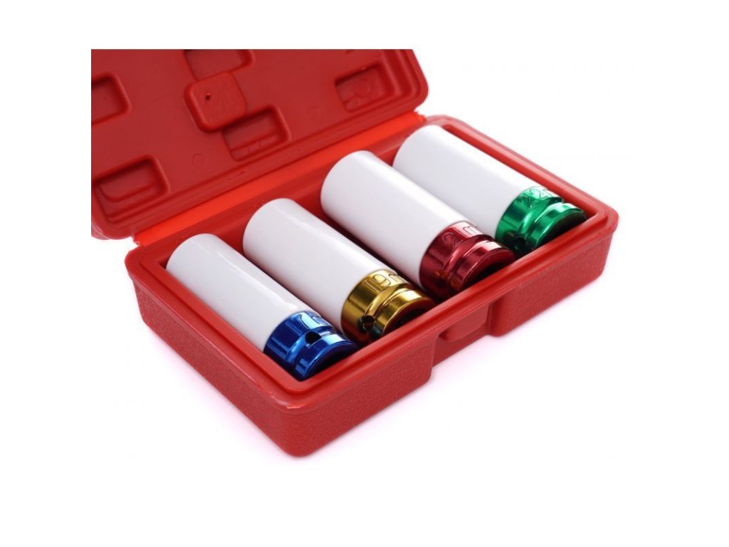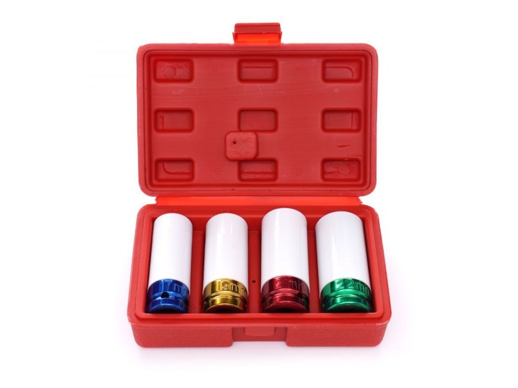 Sada prodloužených hlavic pro kola z lehkých slitin. Sada obsahuje čtyři nástrčné prodloužené hlavice ve velikostech 17, 19, 21 a 22 mm.