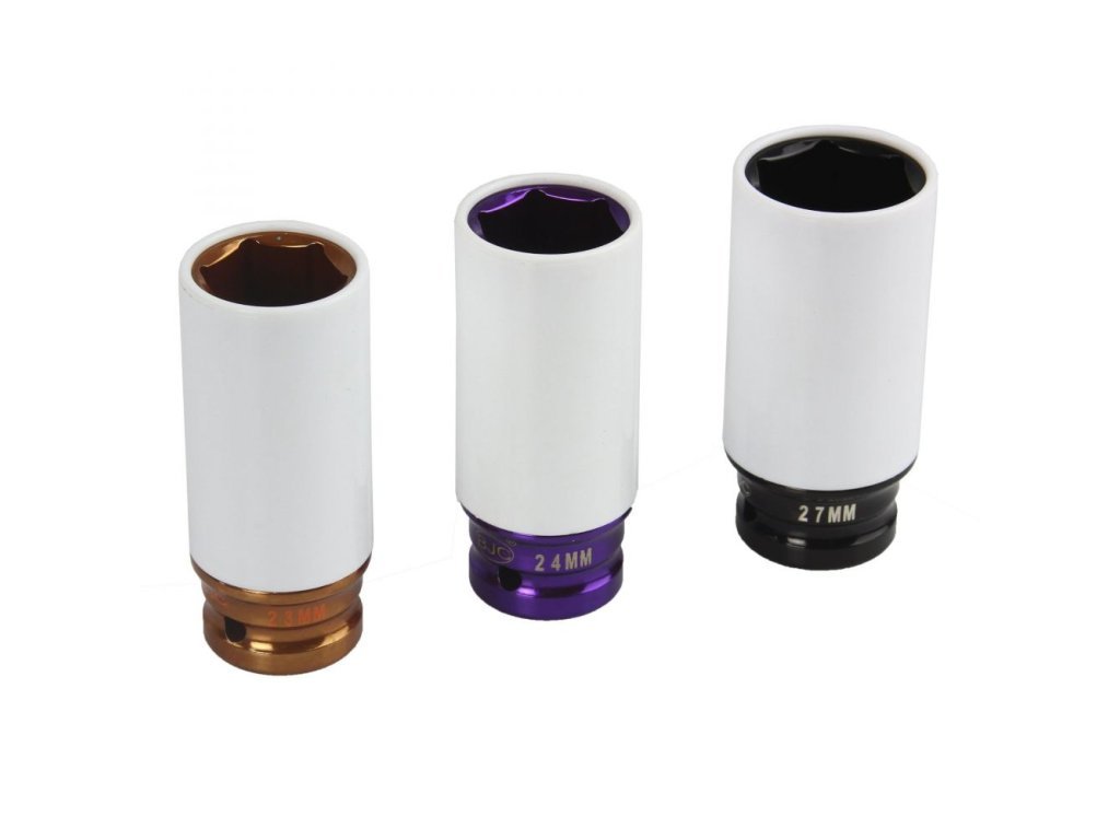 Sada profesionálních dlouhých hlavic pro kola z lehkých slitin. Sada obsahuje 7 hlavic ve velikostech 17, 19, 21, 22, 23, 24 a 27 mm uložené v plastovém kufru. Každá hlavice má plastový kryt, který chrání slitinu před poškrábáním. Každá hlavice má individuální barvu, což umožňuje snadnou identifikaci velikosti. Hlavice jsou navrženy pro práci s 1/2" rázovými utahováky.