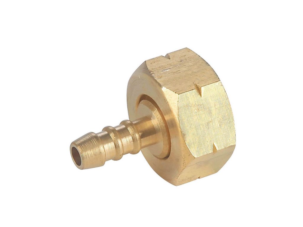 Plynový nátrubek s hrotem pro plynovou hadici, na vstupní straně závit W21,8LH (shodný závit 10 kg plynové láhve).
