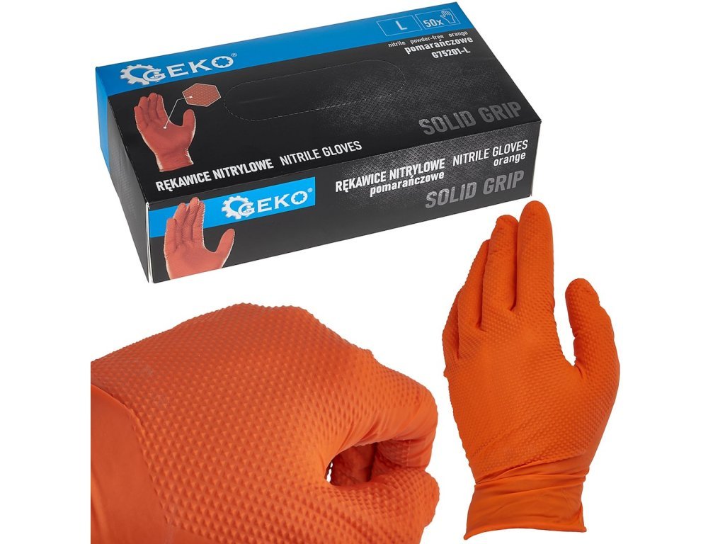 Nitrilové rukavice Solid Grip 3D, pevné, odolné chemikáliím, 50 ks, oranžové, velikost L - GEKO
