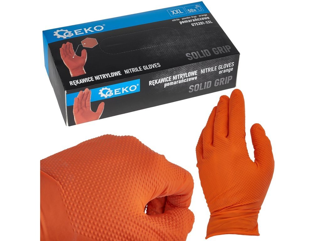 Nitrilové rukavice Solid Grip 3D, pevné, odolné chemikáliím, 50 ks, oranžové, velikost XXL - GEKO