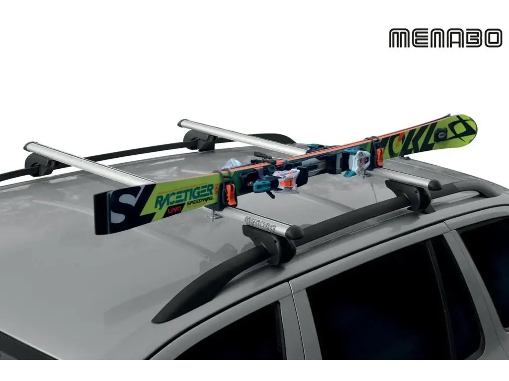 Nosič lyží Menabo Ski RackS nosičem lyží Ski Rack můžete přepravovat 1 pár lyží. Nosič lyží se montuje pomocí "U" šroubového uchycení na střešní nosič. Nosič lyží je vhodný pro příčníky o maximálním profilu 45 mm x 28 mm. Jednoduše naložte lyže, upevněte je pomocí gumového pásku a utěsněte pomocí zajišťovací páčky. Pořiďte si tento cenově výhodný nosič lyží Ski Rack a využijte výhod snadného a spolehlivého montážního systému. Není možné použít adaptér T-drážky. Splňuje ISO/PAS 11154:2006