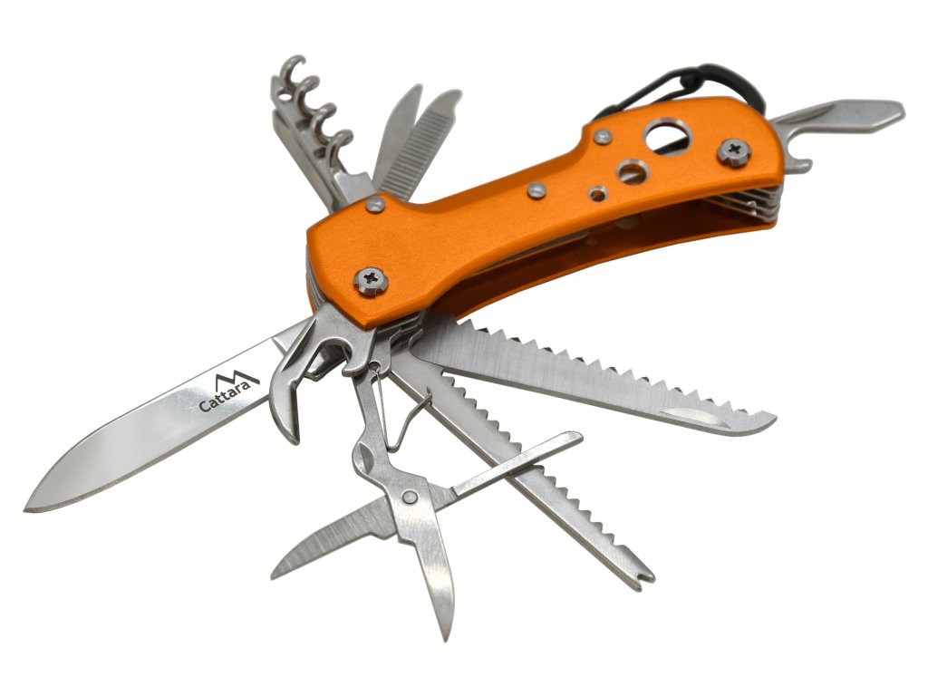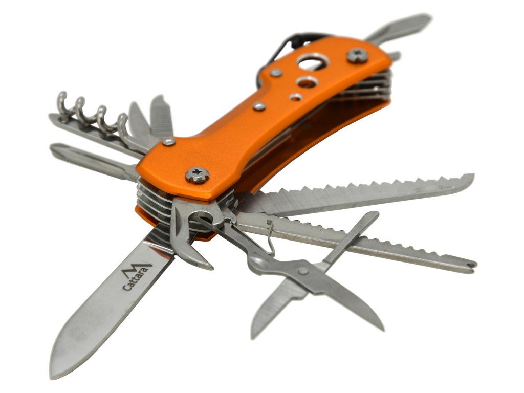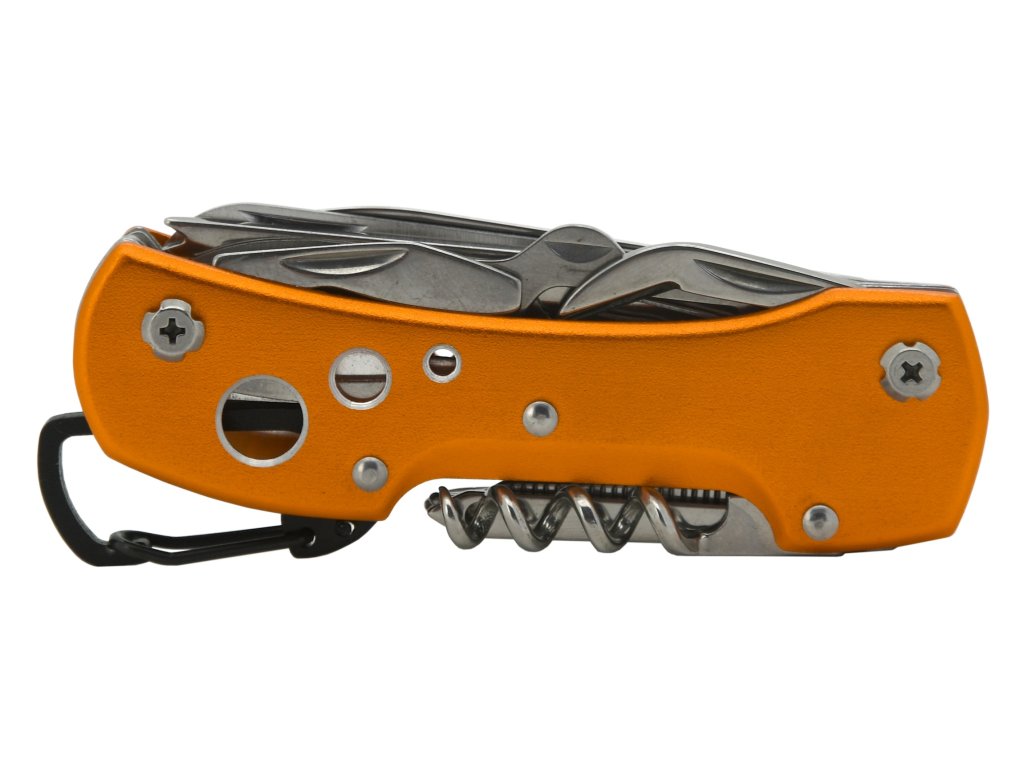 Na vnitřní straně, tedy vespod rukojeti, se skrývají otvírák na plechovky, nůžtičky, škrabák na rybí šupiny, pilka na dřevo a samotný nůž délky 6 cm. Na druhé, vnější straně rukojeti se ukrývají křížový šroubovák nejběžnějších rozměrů, šídlo, pilníček, oko na hrubé šití a vývrtka na korkové špunty. Na zadní straně je rukojeť opatřena očkem pro přichycení např. na klíče a v neposlední řadě otvírákem na zátky, který může být použit i jako plochý šroubovák.