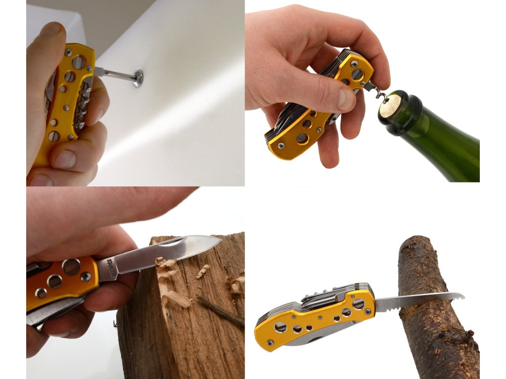 Multifunkční nůž z aluminia žluto-zlaté barvy, s nástroji z nožířské oceli. Užitečný pomocník Multi pro camping, rybaření a další outdoor využití.