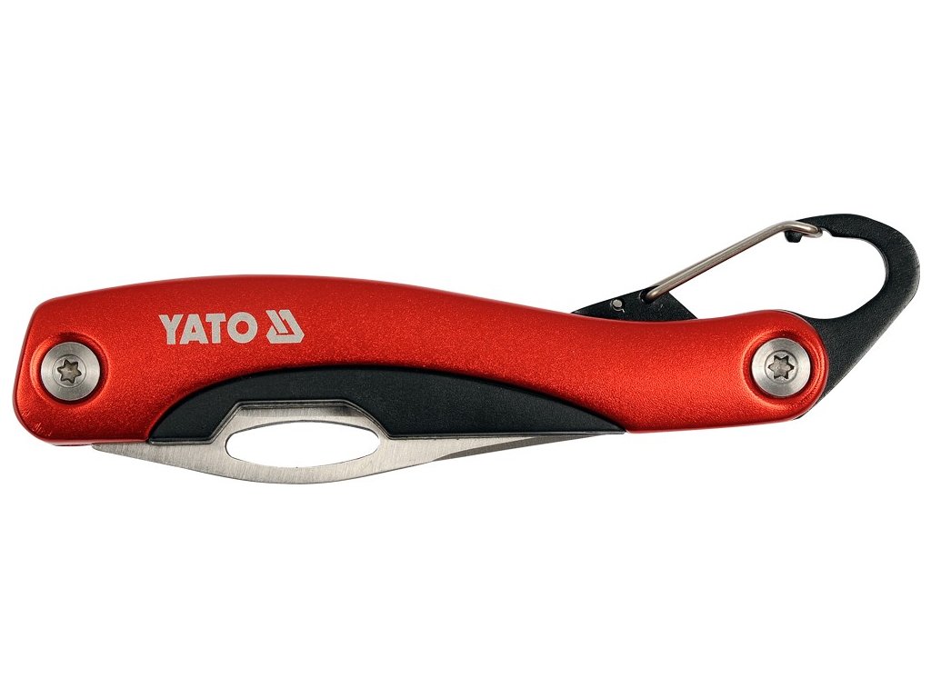 Rukojeť nože je zpracována z eloxovaného hlíníku červené metalické barvy, zakončené karabinkou pro jednoduché uchycení.