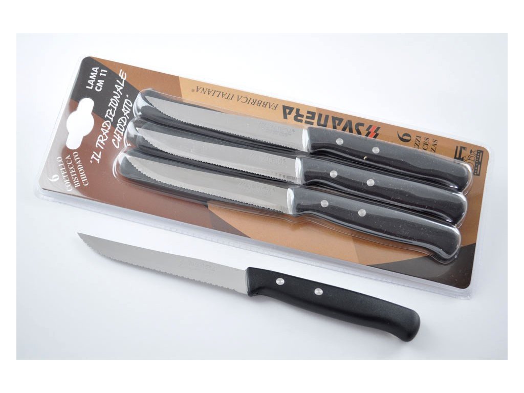 Kvalitní steakové nože s plastovou nýtovanou rukojetí, délka čepele 11 cm, síla čepele 1.2 mm.Vhodné do myčky nádobí, italský výrobce, balení 6 ks.
