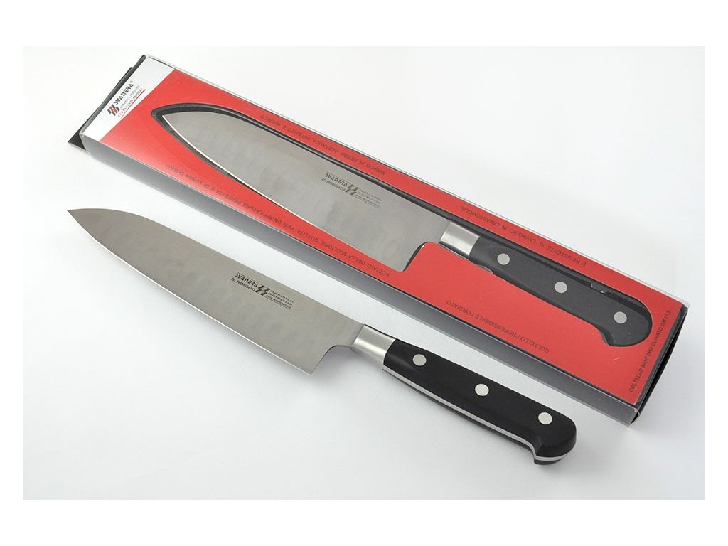 Vysoce kvalitní kovaný nůž santoku s čepelí délky 17.5 cm a plastovou nýtovanou rukojetí, síla čepele 3.5 mm.Vhodný do myčky nádobí, italský výrobce.