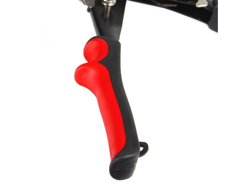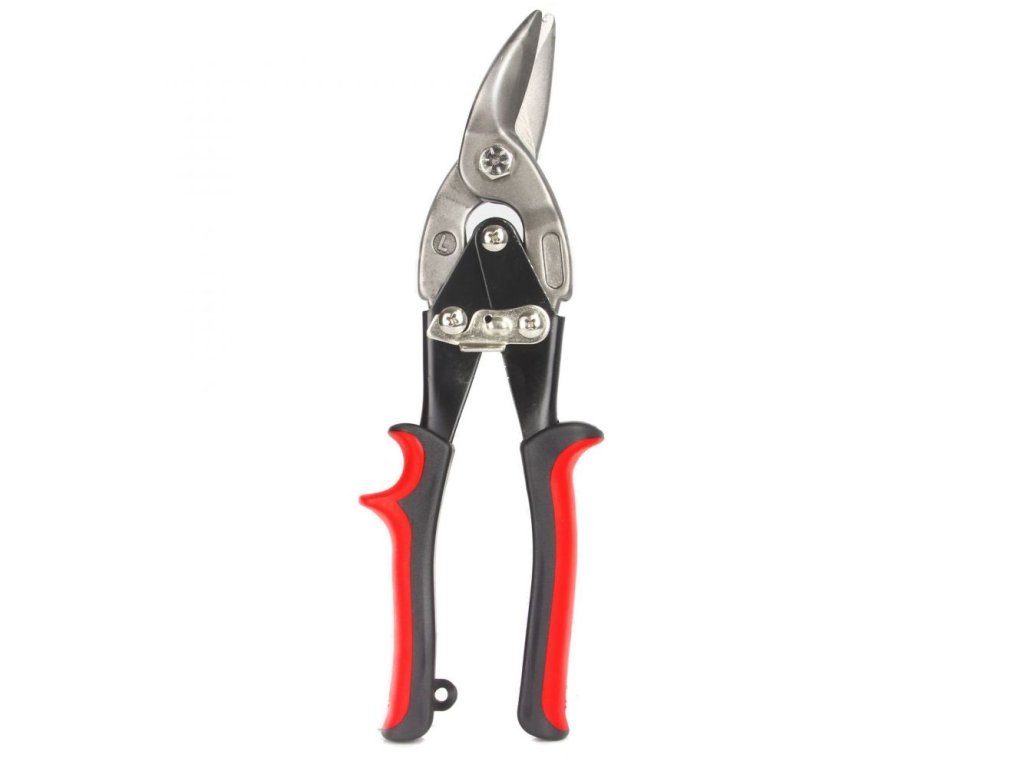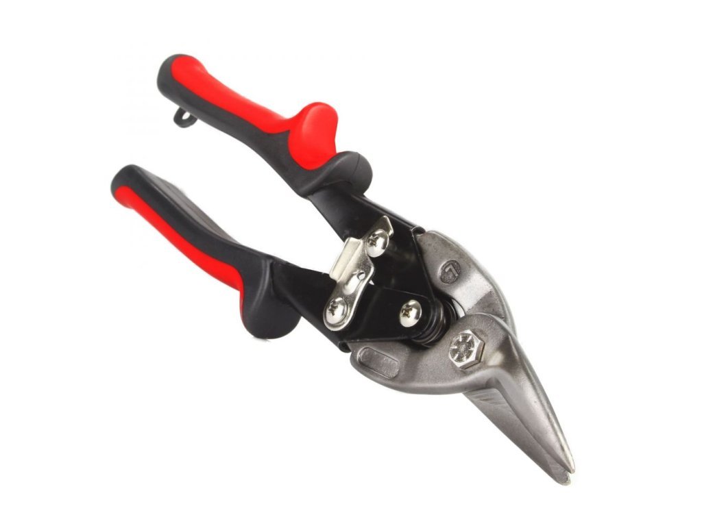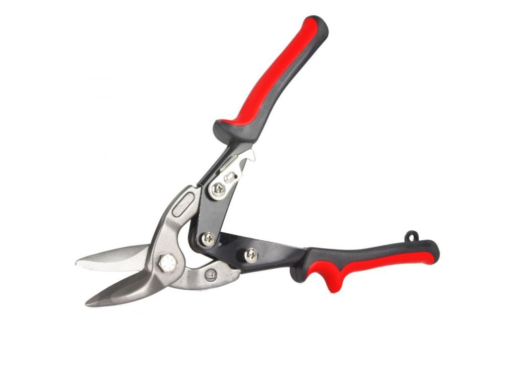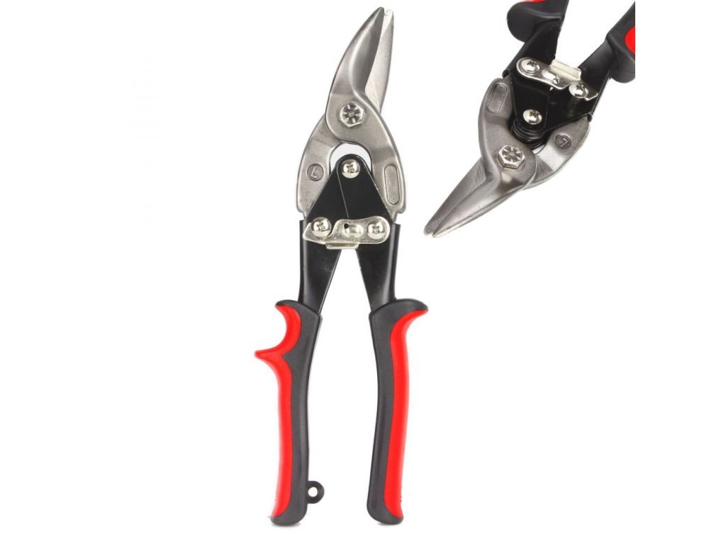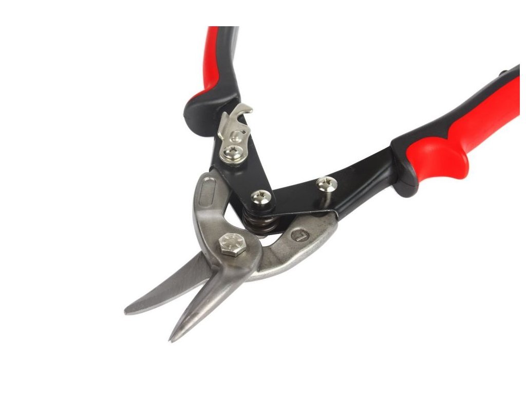 Nůžky na stříhání plechu. Plné nůžkové čepele, navíc zoubkované, které zabraňují sklouznutí z řezaného materiálu. Ergonomicky tvarovaná rukojeť zajišťuje bezpečné a pohodlné uchopení nástroje. Nůžky mají v zavřené poloze zajišťovací mechanismus. Silné ostří stříhá plechy plynule a hladce.