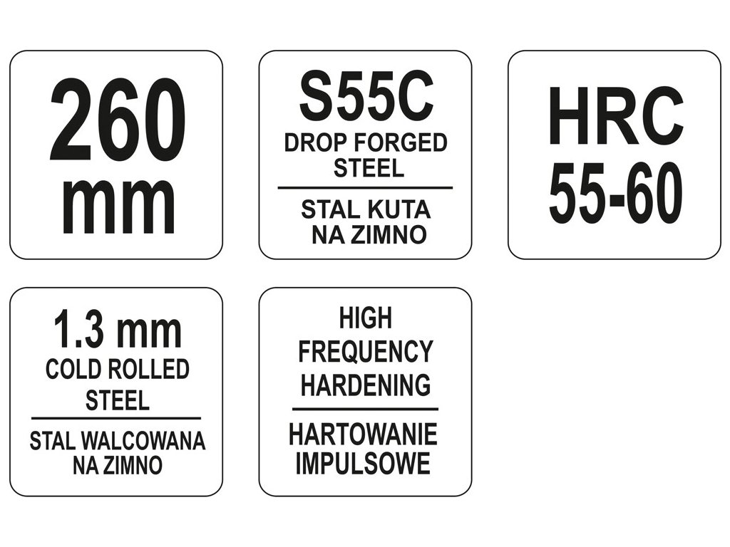 Nůžky německého typu jsou kované za studena z uhlíkové oceli se symbolem S55C HCS. Určeno pro řezání oceli do tloušťky 1,3 mm.