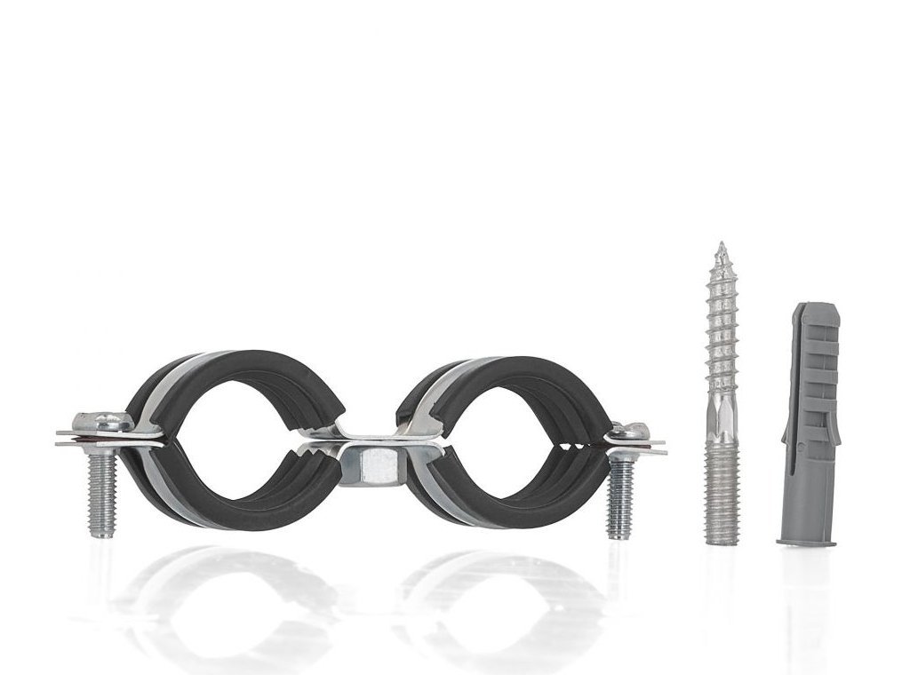 Dvojitá objímka se dvěma šrouby je vyrobená z pozinkované oceli s gumovou vložkou a upevňovací maticí M8. Díky dvěma šroubům lze sevření objímky přizpůsobit vnějšímu průměru potrubí.