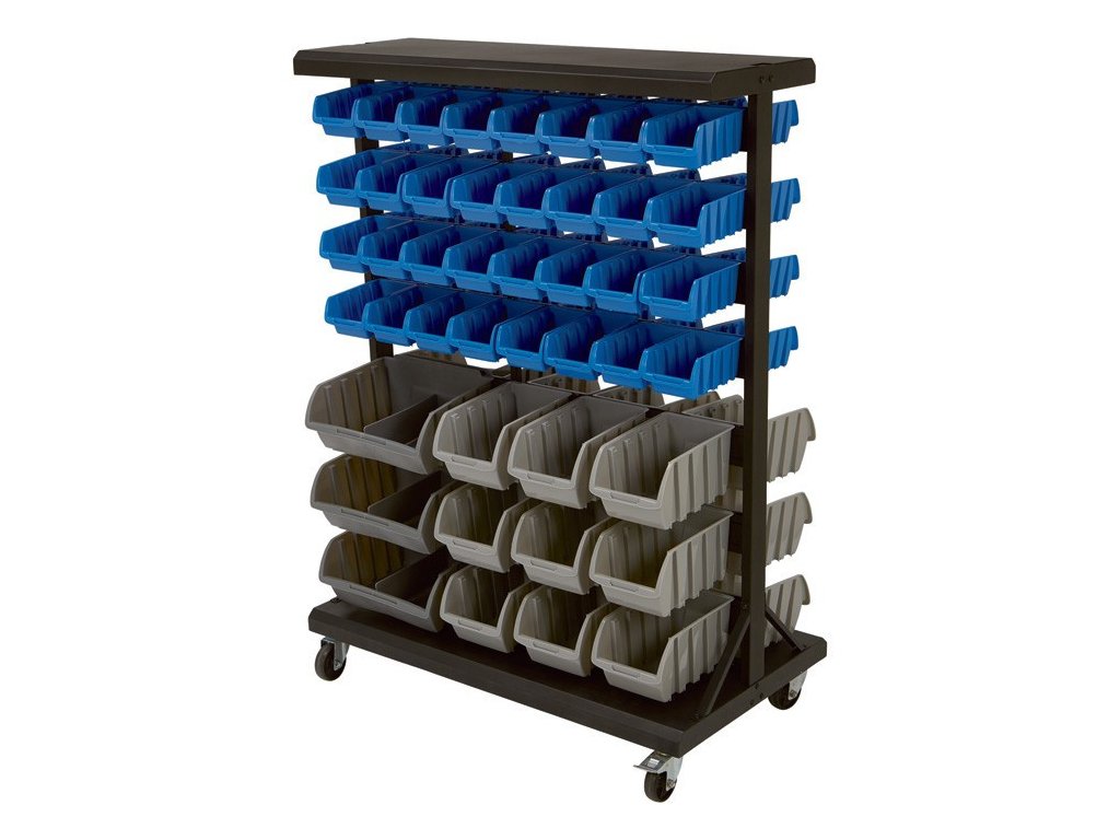 Oboustranný pojízdný kovový organizér na šroubky se skládá s kovového rámu a 14 závěsných lišt pro zavěšení 88 plastových boxů ve třech velikostech a barevných provedeních. Rozměr 950 x 330 x 1180 mm.