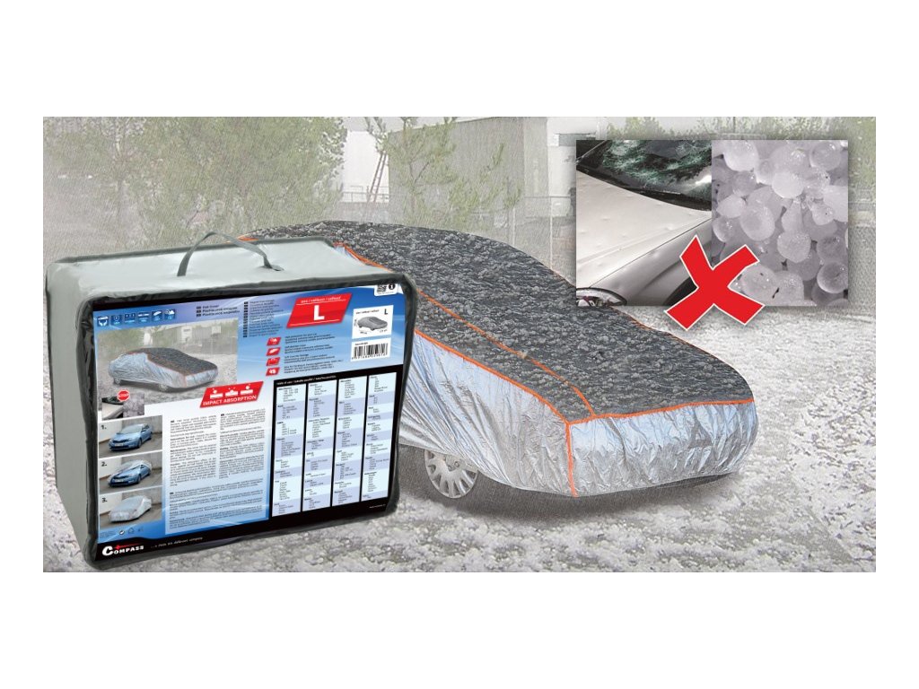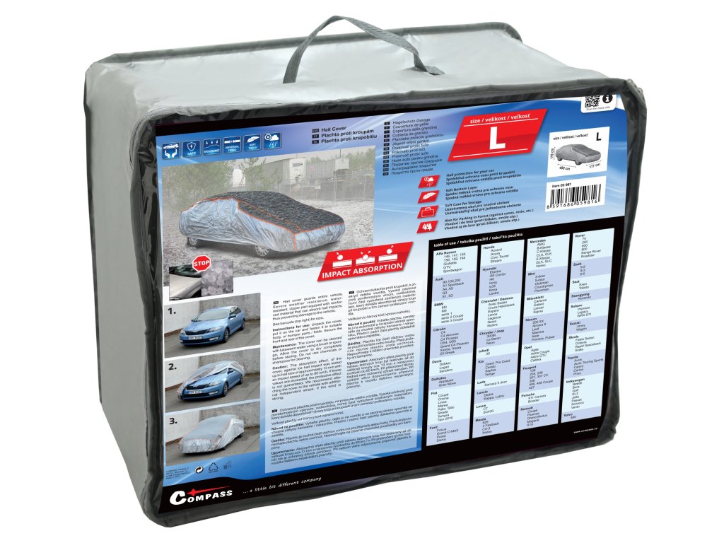 Ochranná plachta proti krupobití, k překrytí celého vozidla. Vysoká odolnost proti povětrnostním vlivům, voděodolná. Horní část vyztužená zesíleným materiálem, který dokáže absorbovat nárazy krup při krupobití a tím zamezí poškození vozidla.