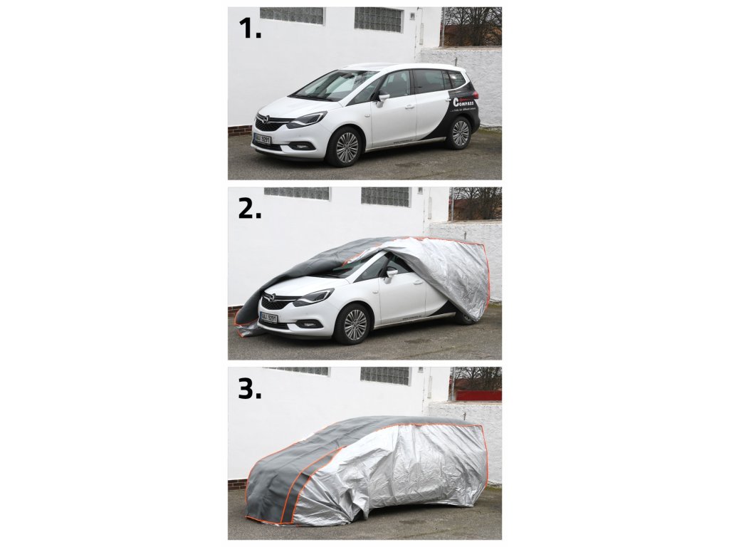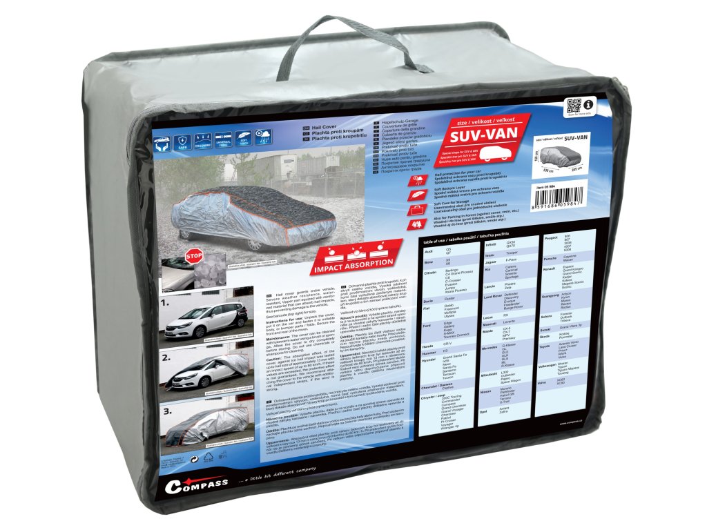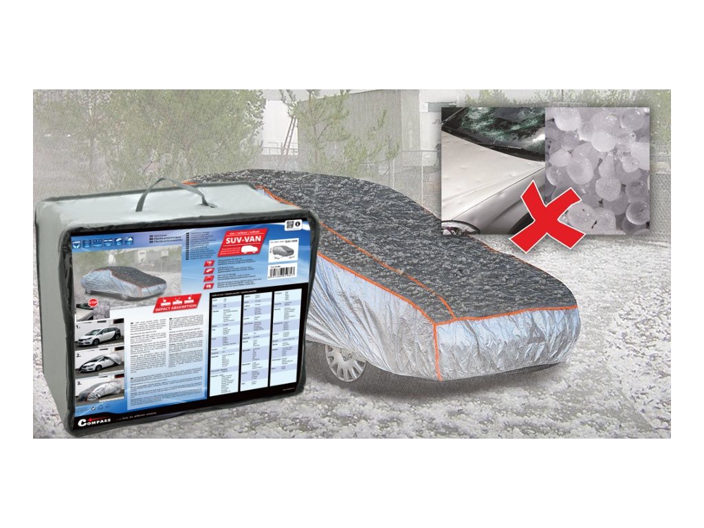 Ochranná plachta proti krupobití, k překrytí celého vozidla s vysokou odolností proti povětrnostním vlivům. Horní část vyztužená zesíleným materiálem, který dokáže absorbovat nárazy krup při krupobití a tím zamezí poškození vozidla.