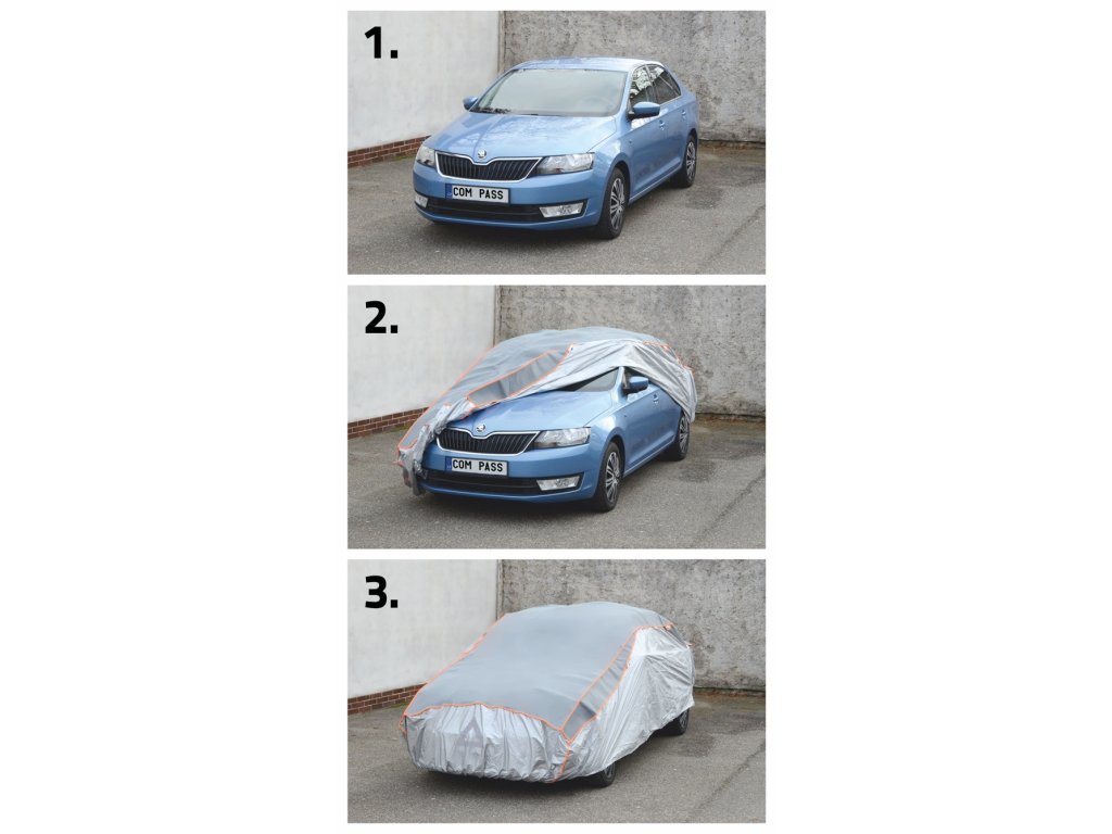 Jednoduché upevnění plachty - pouze se nasadí na automobil, na spodku se upevní část s všitou gumou za vhodné záhyby karoserie / nárazníku a přední i zadní část plachty se důkladně upevní pomocí všitých popruhů se sponami.
