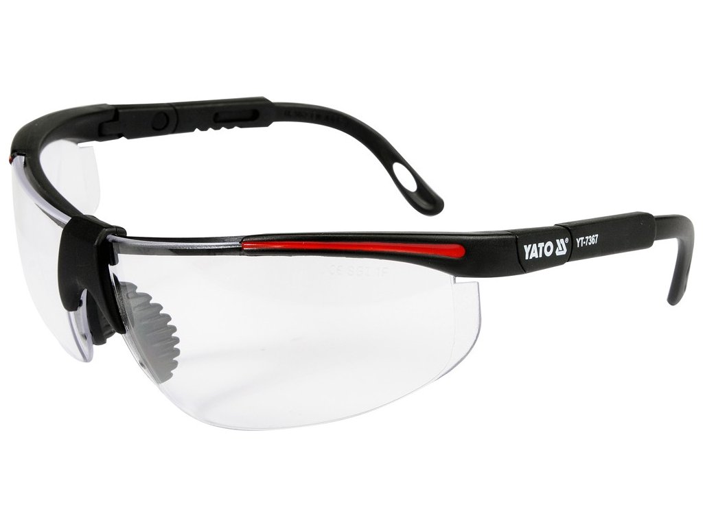 Ochranné brýle z polykarbonátu, s délkově nastavitelnými ramínky, které lze navíc pomocí otvorů na koncích opatřit např. gumičkou pro zavěšení na krk.