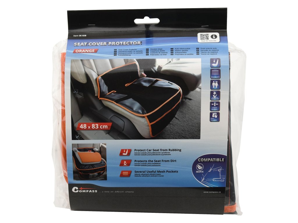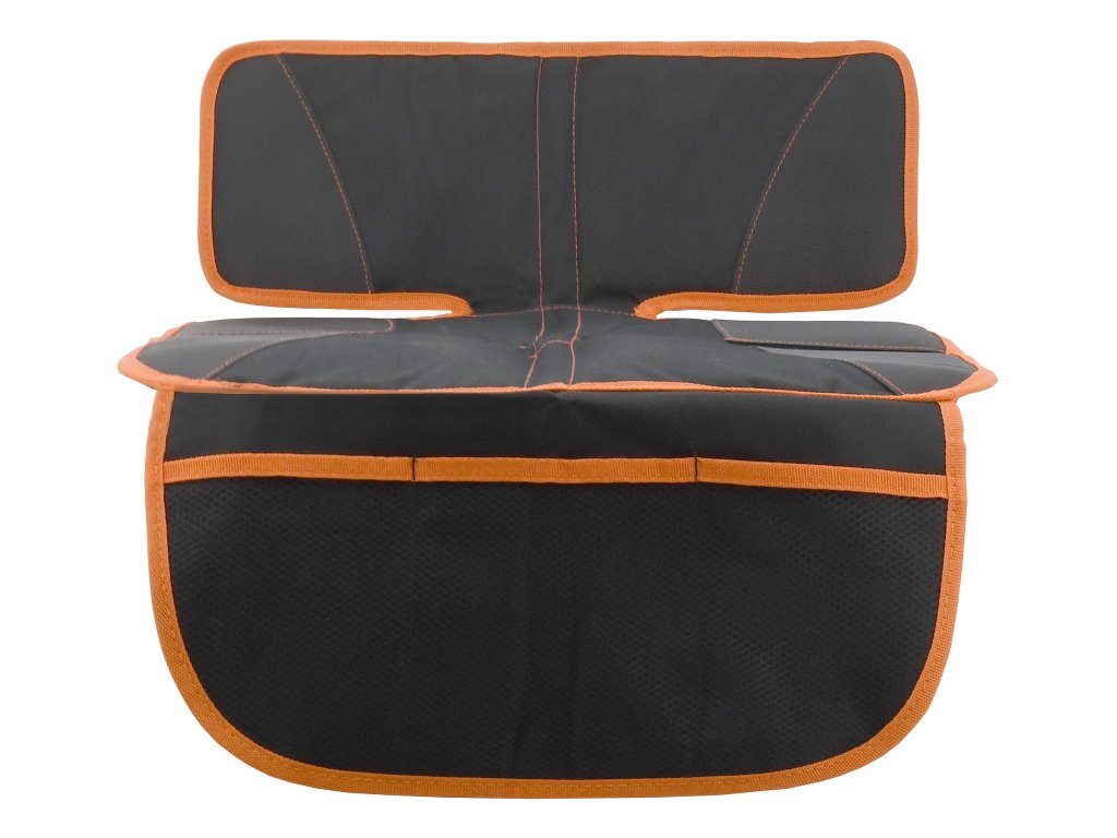 Praktický ochranný potah o rozměrech 48 x 83 cm zhotovený z odolného polyesteru, obšitého oranžovým lemem. Spodní vrstva je díky perforaci prodyšná a zároveň drží potah na místě.