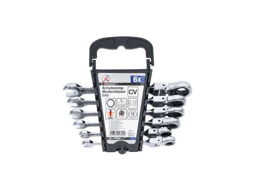 6tidílná sada očkoplochých klíčů s ráčnovým mechanismem se 72 zuby, díky čemuž je k práci potřeba extra malý úhel 5° - vhodné pro práci v malých prostorách.
