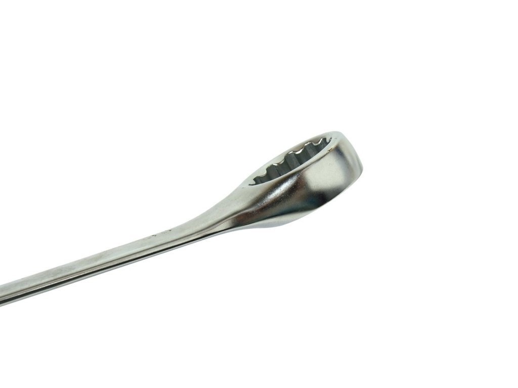 Plochá hlava je zahnutá pod úhlem 15° k ose rukojeti, což umožňuje efektivní práci i v místech s omezeným přístupem. Očková část je vybavena 12hranným profilem se zahnutou hlavou pod stejným úhlem 15°, což poskytuje vynikající úchop a minimalizuje riziko poškození šroubů a matic.
