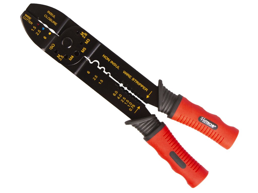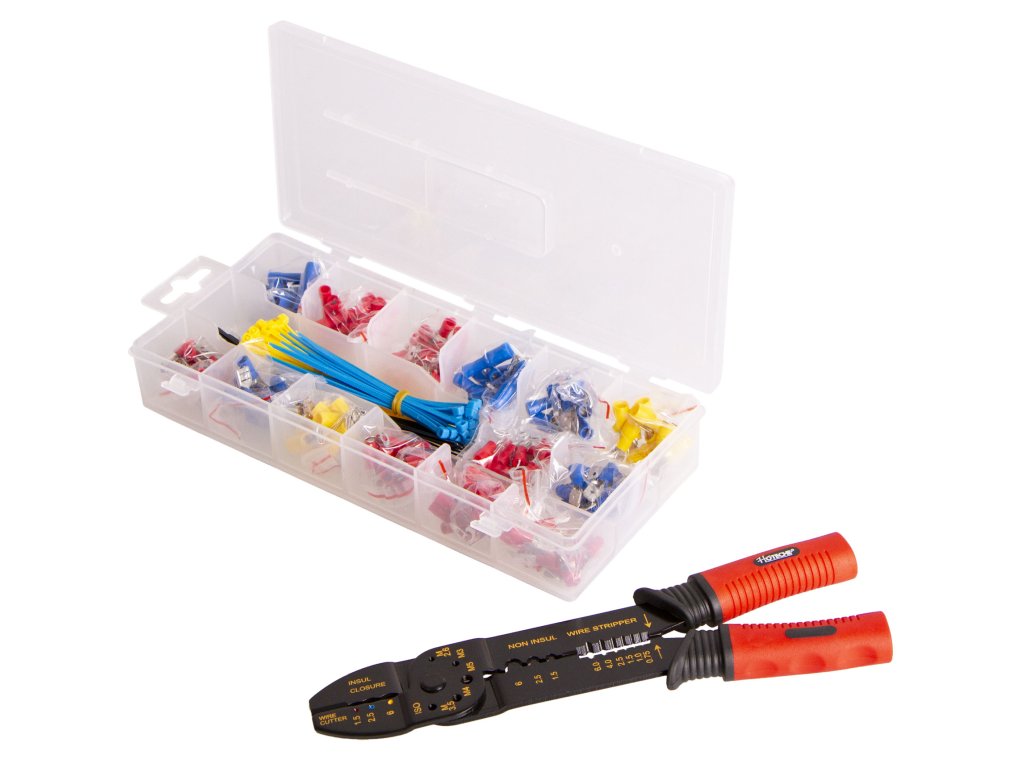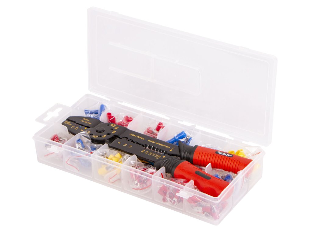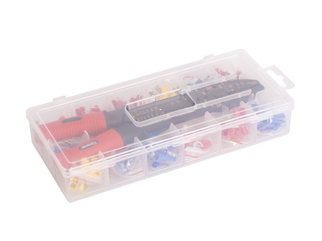 Odizolovací kleště od značky Hoteche v plastovém boxu společně se 17-ti druhy konektorů, bužírek a stahovacích pásek.