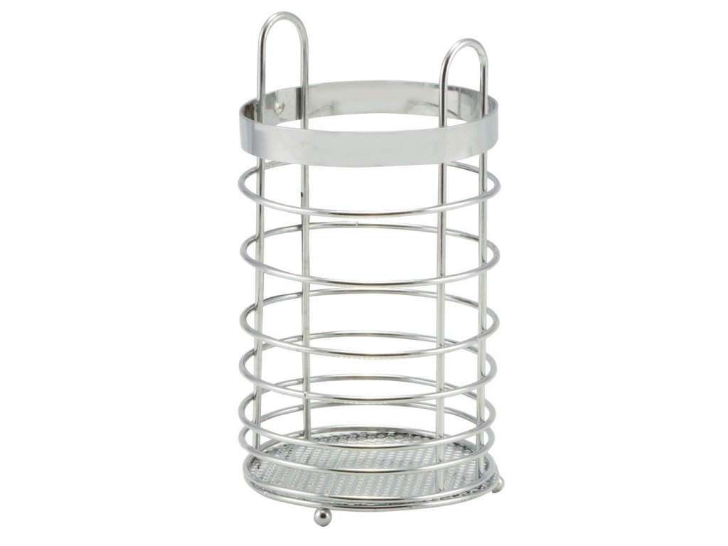 Kovový chromovaný kulatý odkapávač na příbory, vařečky a jiné.Průměr 11 cm a výška 20 cm.