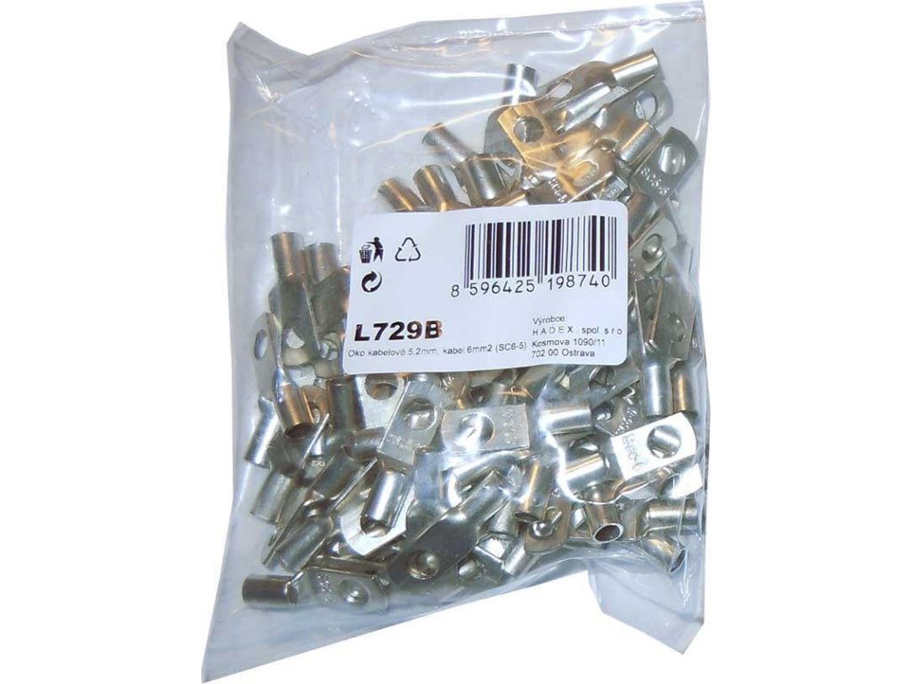 Oko kabelové 5,2mm, kabel 6mm2 (SC6-5) průměr oka 5,2mm, vnitřní průměr dutinky 3,8mm, délka dutinky 18mm, kabel 6mm2Doplňkové parametry