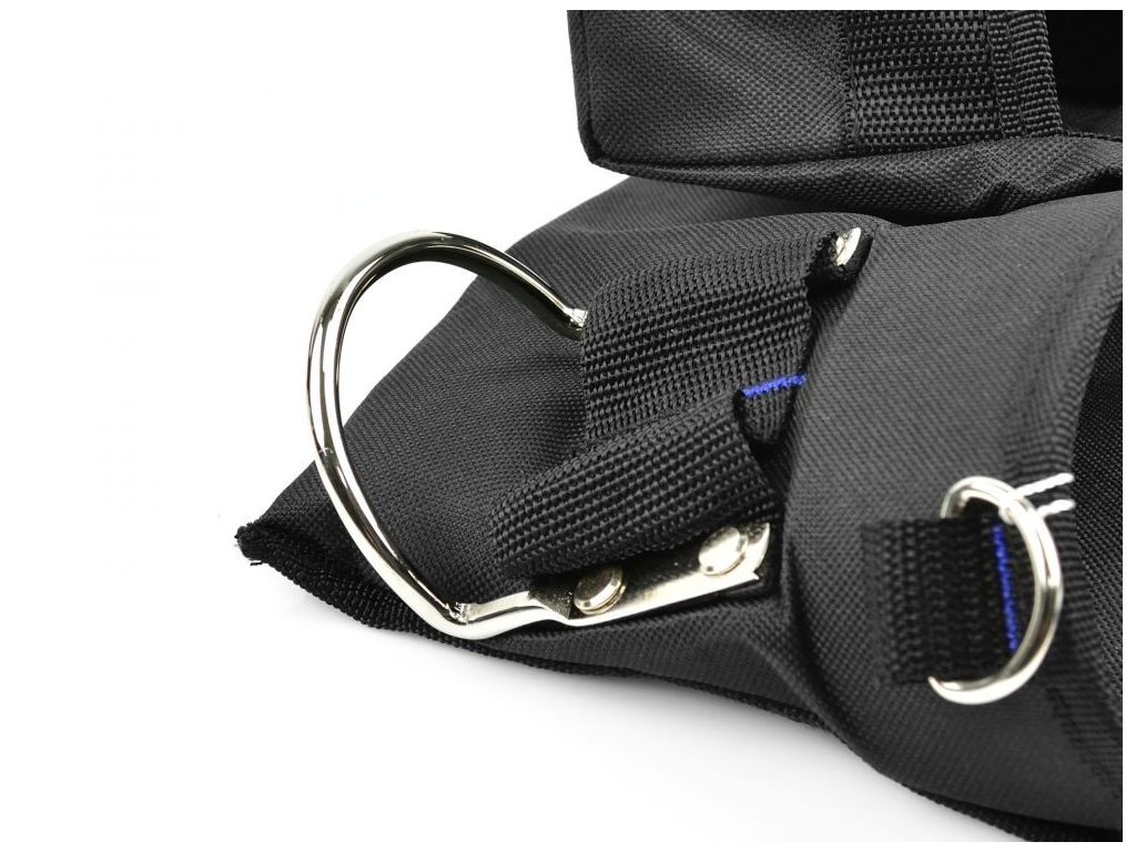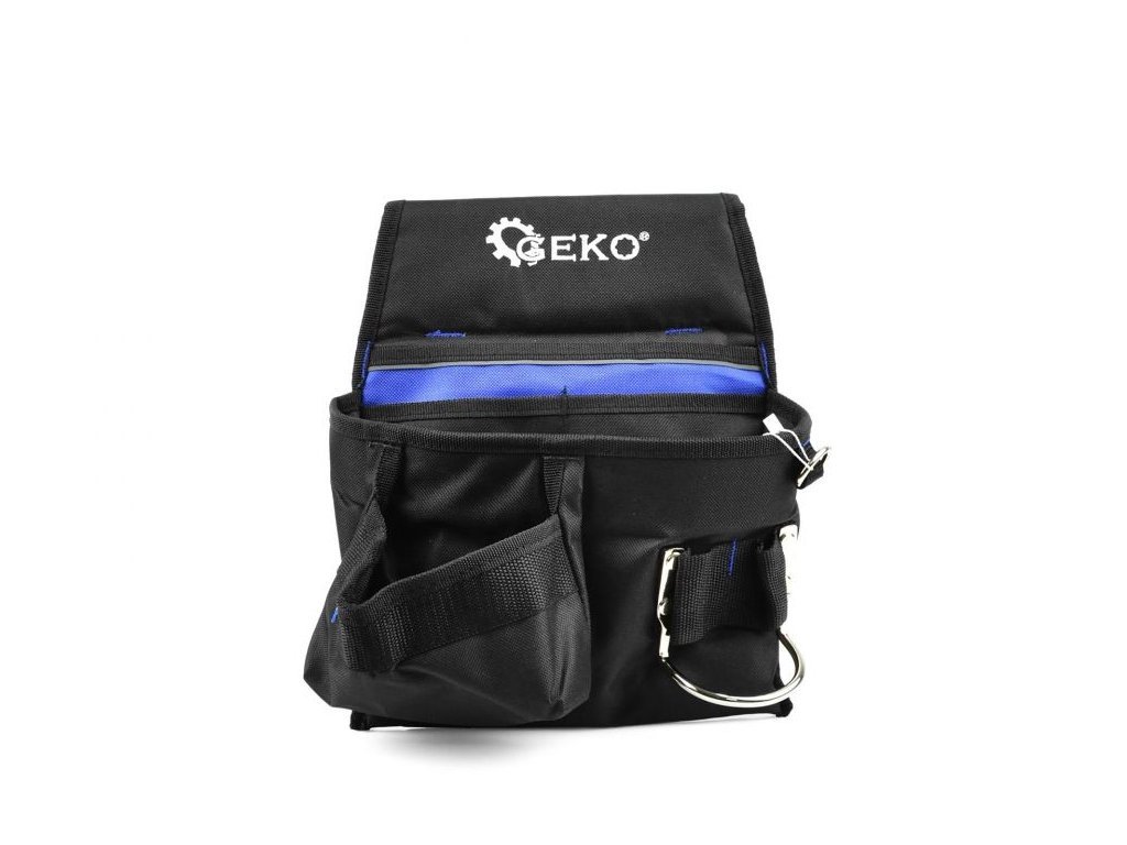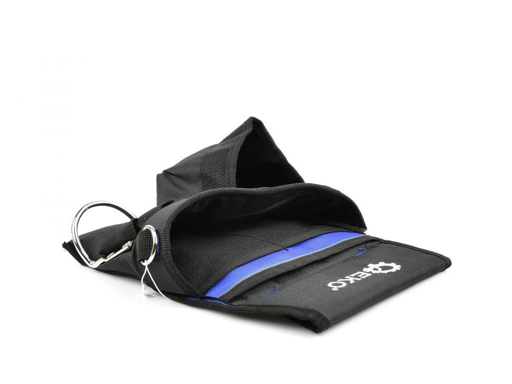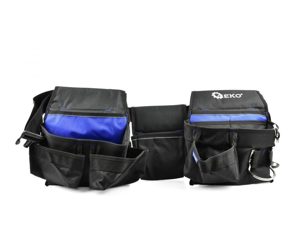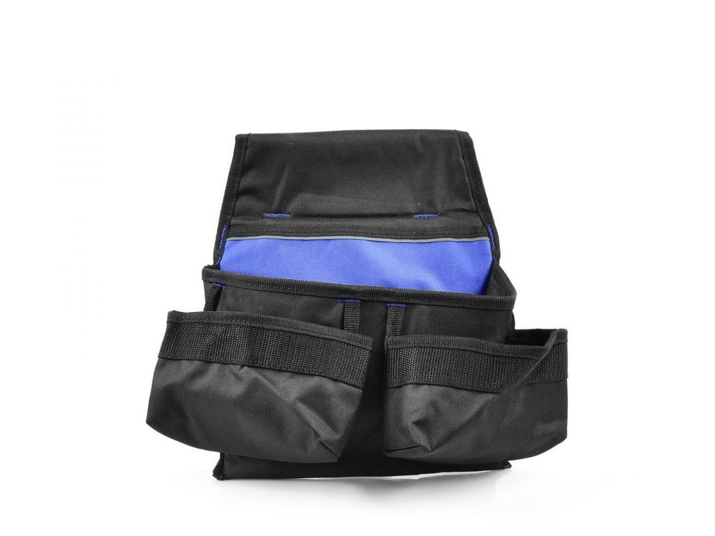 Opasek na nářadí s třemi závěsnými kapsami, vyrobený z polyesteru odolného proti oděru. Závěsné kapsy mají celkem deset kapes, které umožňují pohodlně přenášet různé druhy nářadí a příslušenství, jako jsou šrouby, hřebíky, vruty atd. Jedna z kapes je navíc vybavena integrovaným držákem na kladivo