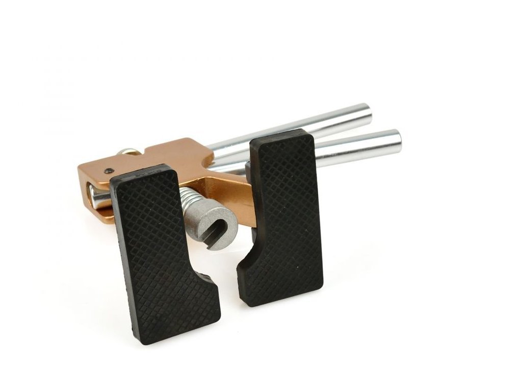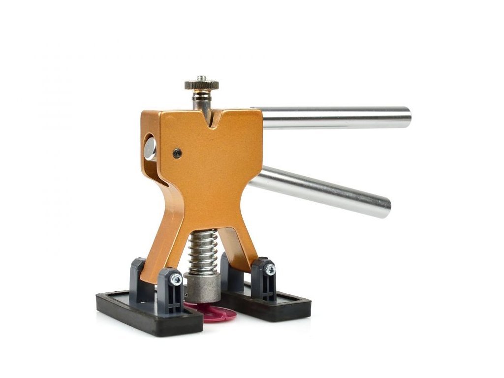 - Přiložte stahovák ke karoserii vozu, šroub stahováku povolte tak, aby zachytil vyčnívající část podložky. Zašroubujte šroub stahováku a poté pomalu stlačte rukojeť, abyste odstranili důlek.