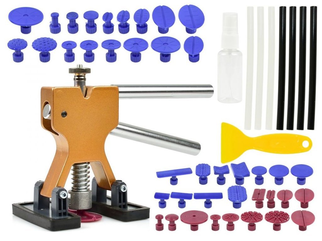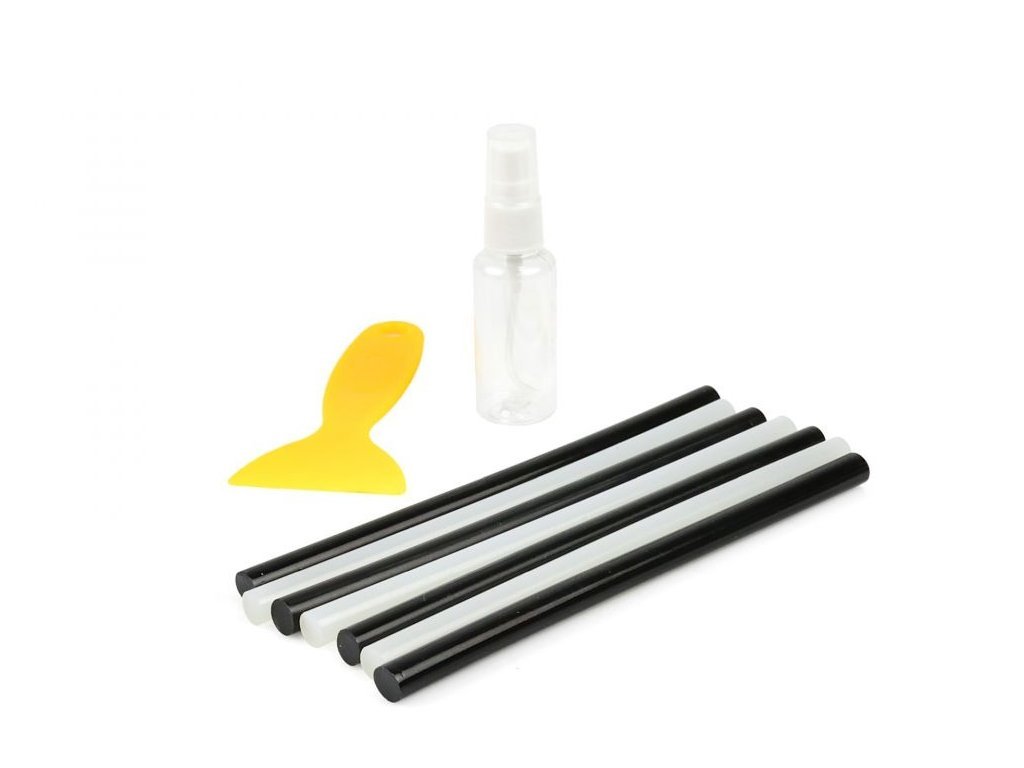 Opravná sada určená k odstranění promáčklin na karoserii vozu. Sada je snadno ovladatelná a hlavně 100% bezpečná pro lak auta. Sada obsahuje stahovák na odstranění promáčklin, sadu 40 ks pryžových podložek různých tvarů a velikostí, 7 tyčinek tavného lepidla, špachtli na odstranění lepidla a 100 ml lahvičku s rozprašovačem, která slouží pro aplikaci odmašťovací látky a vyčistění povrchu vozu, která není součástí balení.