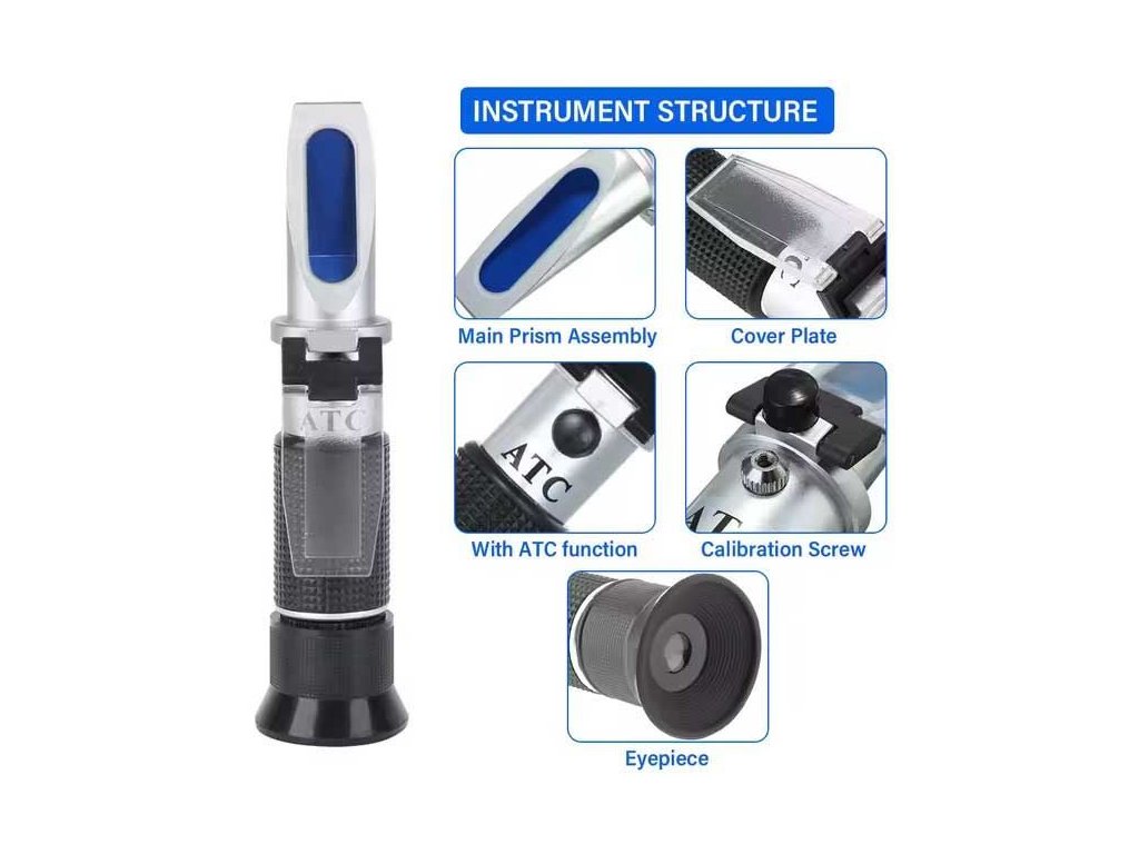 Optický refraktometr ATC na víno, 0-40% Brix, 0-25% Alc Refraktometr určený k měření koncentrace cukru v roztoku vína, piva či likéru a odhadovaného obsahu alkoholu po fermentaci.**Specifikace:**