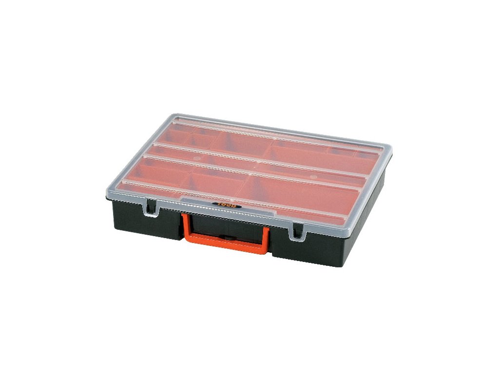 Kufr – organizér 33x27x7 cm, 16 vyjímatelných přihrádek, průhledné víko, umělohmotný, černo-oranžová barva – TOOD TO716