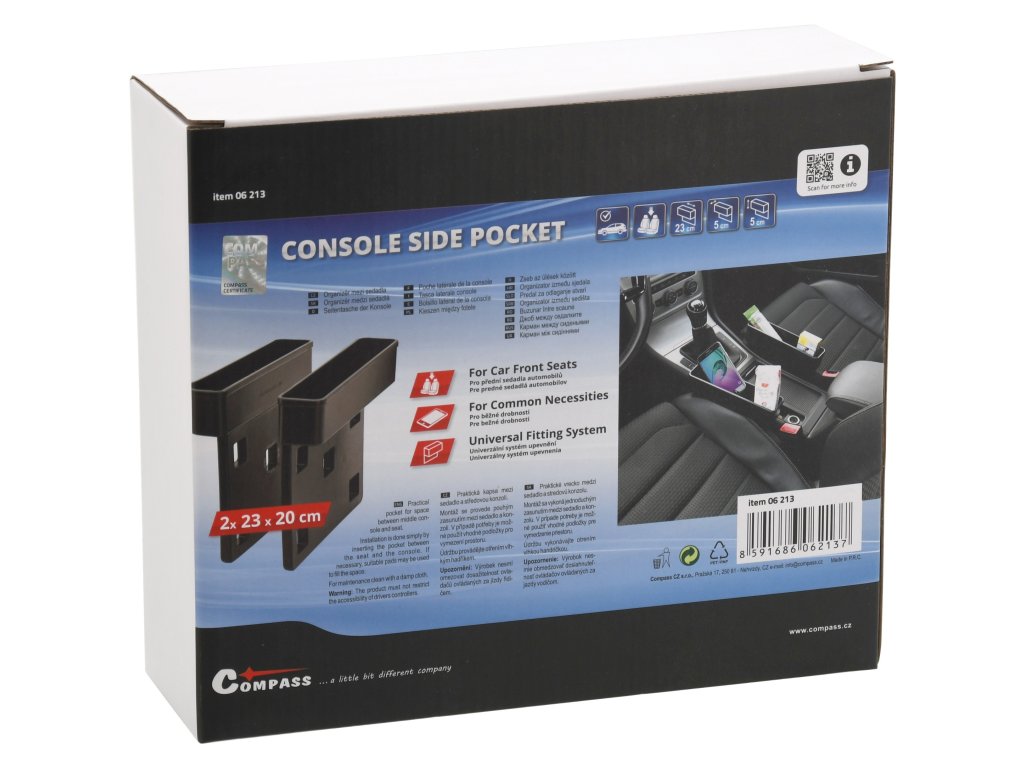 Montáž se provede pouhým zasunutím mezi přední sedadlo a konzoli. V případě potřeby je možné použít nalepovací podložky pro vymezení prostoru a zamezení svévolnému pohybu organizérů.