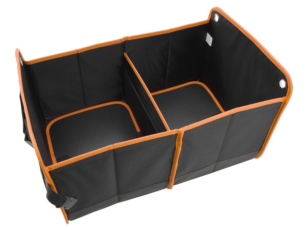 Skládací, dvoudílný organizér do kufru automobilu.