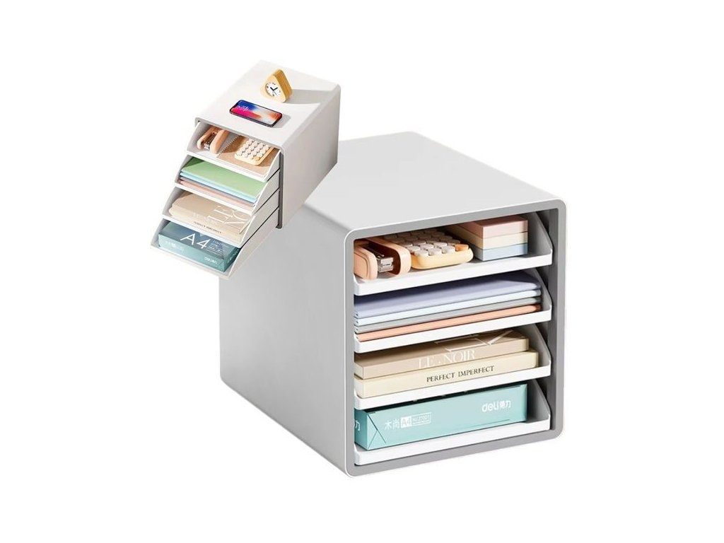 Organizér na dokumenty 4 výsuvné zásuvky Tento kancelářský organizér se čtyřmi prostornými zásuvkami je perfektním řešením pro udržení pořádku na stole a pro udržení všech nezbytností po ruce. Díky kompaktním rozměrům je ideální jak pro domácí kancelář, tak i pro pracoviště. Do každé zásuvky se snadno vejdou dokumenty A4 , sešity, poznámkové bloky a kancelářské potřeby.TECHNICKÉ SPECIFIKACE: