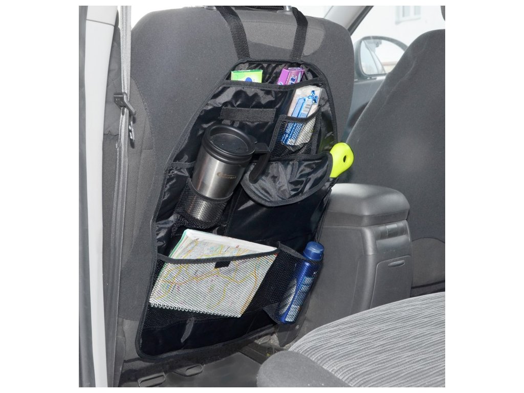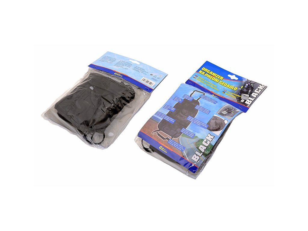 Organizér určený k připevnění na zadní stranu předního sedadla. Upevnění horní části pomocí popruhů za opěrku hlavy, spodní části popruhy za sedadlo. Jedinečné uspořádání - několik různých kapes vhodných pro mapy, nápoje a různé drobnosti.