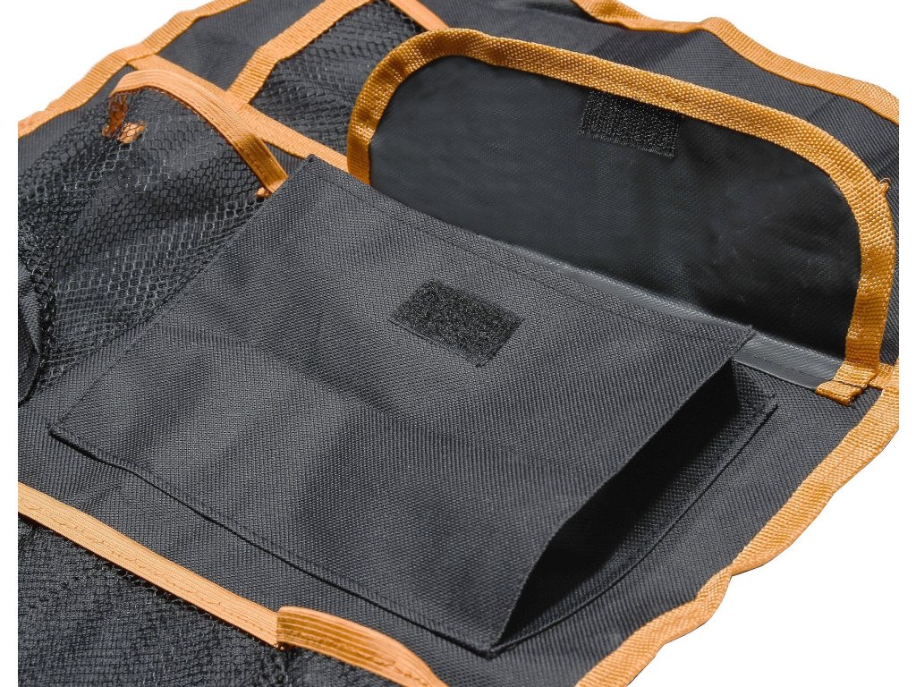 Disponuje kapsami, sítěnými přihrádkami, držáky na lahve a uzavíratelnou kapsou na suchý zip. Organizér je zhotoven ze 100% polyesteru, kvalitně obšitého oranžovým lemem. Kapsy jsou opatřeny gumou oranžové barvy.