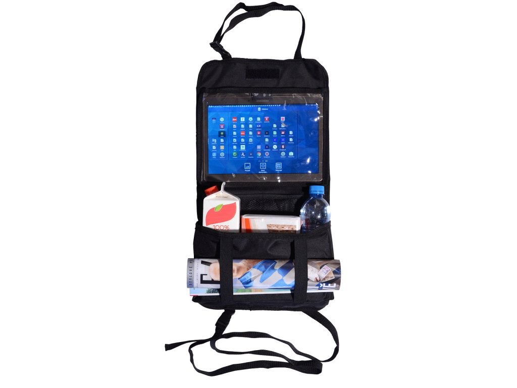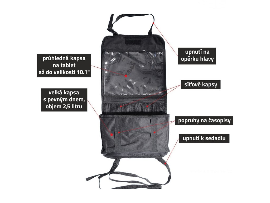 Organizér k připevnění na zadní stranu předního sedadla. Upevnění horní části pomocí popruhů za opěrku hlavy, spodní části popruhy za sedadlo.